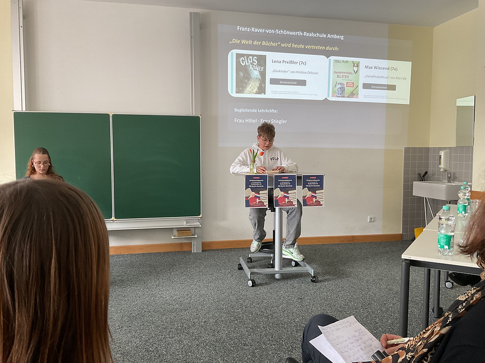 Ein ganz neues Format für Lesefreudige wurde dieses Jahr von der Regierung der Oberpfalz ins Leben gerufen. Neben dem bekannten bundesweiten Vorlesewettbewerb der sechsten Klassen gibt es nun einen Vorlesewettbewerb für die siebten Klassen der Realschulen. Und so freuten wir uns, dass wir unsere Schulsieger Lena Preißler (7c) und Max Wiesend (7e) beim Regionalentscheid in Schwandorf ins Rennen schicken konnten. Gegen die Mitbewerber der zwei Schwandorfer Realschulen und der Knabenrealschule Neumarkt zeigten die beiden mit den Büchern „Glaskinder“ und „Dampfnudelblues“, was sie konnten. Und das war viel! Betont, spannend, lustig, mal leiser, mal lauter, teilweise sogar Dialekt – all diese Nuancen beherrschten Lena und Max und konnten damit bei der Jury punkten. Aufgeregt warteten wir Lehrerinnen und unsere beiden Vorleser auf die Bekanntgabe der Sieger und freuten uns sehr, dass Lena den Regionalentscheid gewinnen konnte. Super, Lena! Nun darf sie beim Finale – dem Oberpfalzentscheid – unsere Schule vertreten. Wir drücken ihr jetzt schon die Daumen!